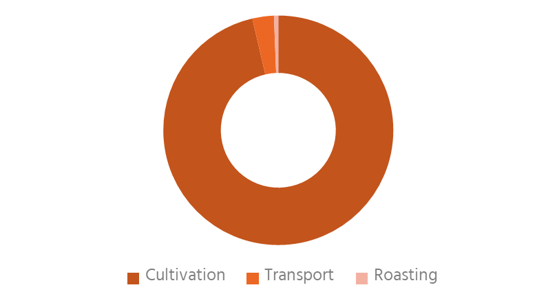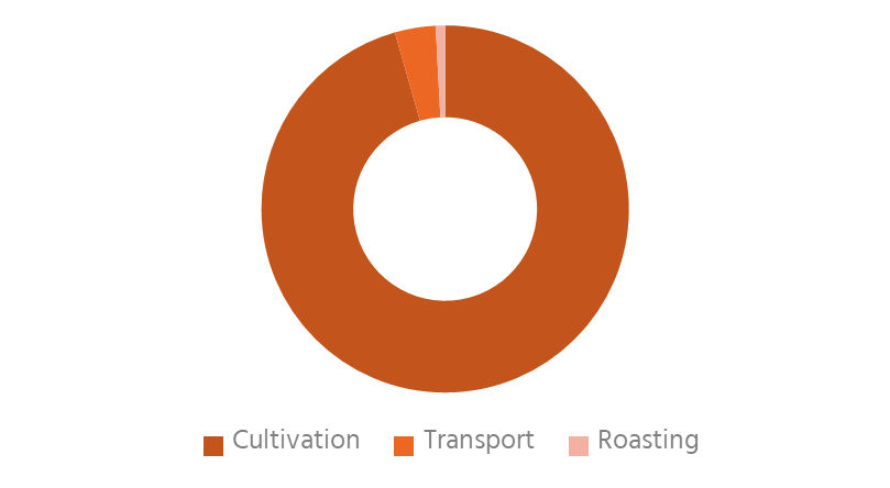 Most of the CO2 emissions relate to the activities on the plantations, such as in the use of fertilizer (such as the fertilizer of birds in Peru) and the production of pesticides (only in Brazil). Transport and roasting contribute relatively little to climate change per kilogram of coffee.