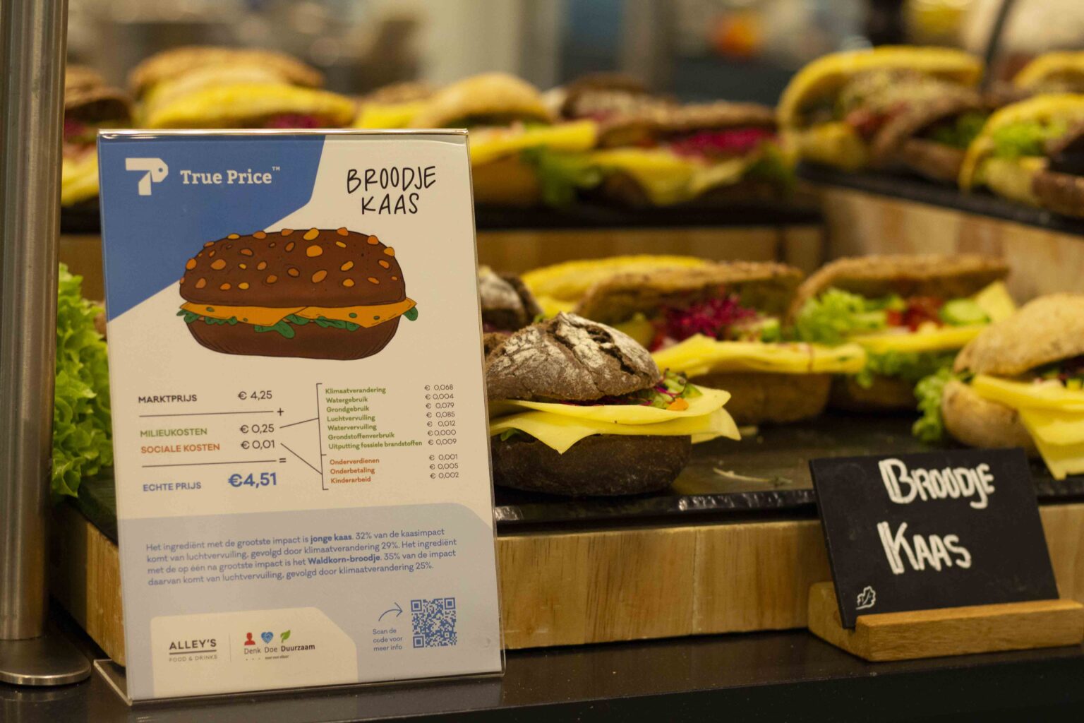 Vanaf februari start het Ministerie van Infrastructuur en Waterstaat in samenwerking met ISS de pilot ‘True Price’. Voor deze pilot is de echte prijs berekend voor 15 producten uit het assortiment. Van broodje kaas tot krentebol is nu dus de True Price bekend. Dat betekent dat niet alleen de consumentenprijs van het product wordt gecommuniceerd, maar ook de verborgen kosten. Dit kunnen sociale kosten zijn zoals kinderarbeid of onderbetaling. Maar ook ecologische kosten voor landgebruik en CO2-uitstoot. Het worden verborgen kosten genoemd omdat deze kosten niet meegenomen worden in de kostprijs, waardoor de kostprijs lager is dan de echte prijs. Het doel van de pilot is om bezoekers meer bewust te maken van verborgen sociale en ecologische kosten van producten. Bij de kassa kunnen de bezoekers vrijwillig de echte prijs betalen. Het extra opgehaalde bedrag wordt aan het einde van de pilot verdeeld onder een sociaal en een ecologisch goed doel, die door het Ministerie van Infrastructuur en Waterstaat gekozen zijn: Trees for All én Circular Green.